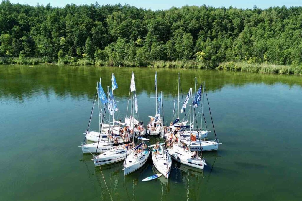 Flotylla kilkunastu jachtów, bezpieczne jeziora i sternik na pokładzie – nie trzeba mieć doświadczenia.